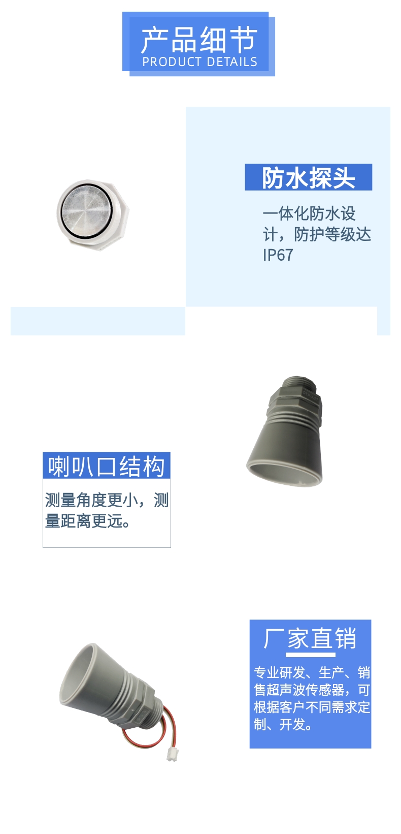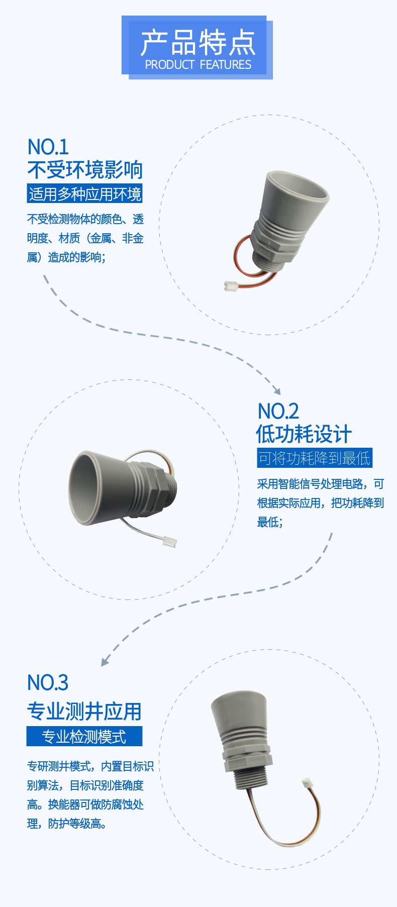 超聲波測(cè)井傳感器,是一種使用超聲波傳感技術(shù)進(jìn)行測(cè)距的模組。傳感器電路采用智能信號(hào)處理,內(nèi)部使用高性能處理器、高品質(zhì)元器件;內(nèi)置目標(biāo)識(shí)別算法、高精度測(cè)距算法和功耗管理程序;板載溫度補(bǔ)償功能,可自動(dòng)修正溫度偏差;支持遠(yuǎn)程升級(jí),軟件算法可靈活調(diào)整;超聲波換能器可做防腐蝕處理,防護(hù)等級(jí)達(dá)IP67。適用于多種室外環(huán)境,如:智慧水務(wù)、智慧城市、智慧農(nóng)業(yè)等物聯(lián)網(wǎng)應(yīng)用。