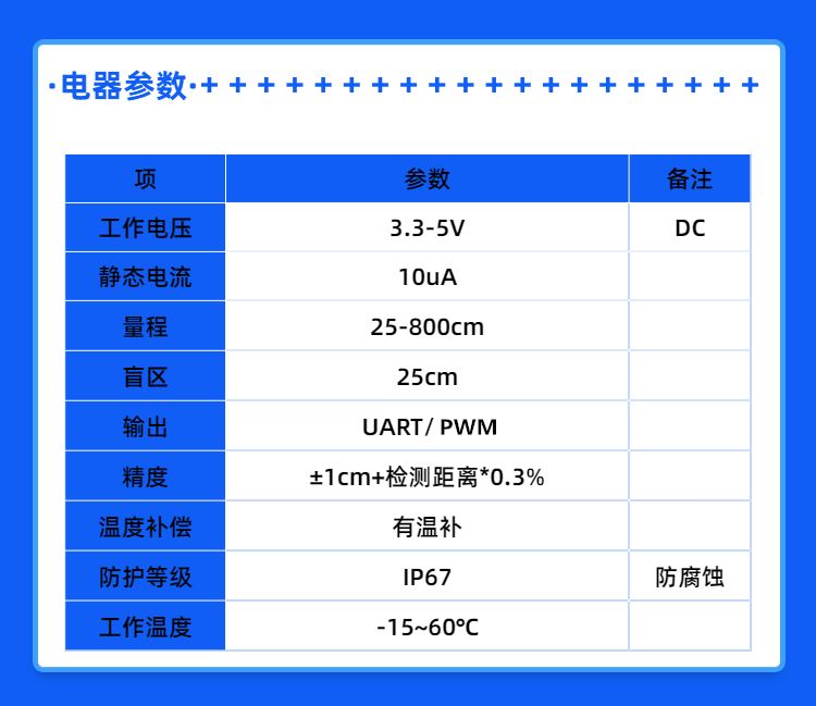超聲波測井傳感器,是一種使用超聲波傳感技術進行測距的模組。傳感器電路采用智能信號處理,內部使用高性能處理器、高品質元器件;內置目標識別算法、高精度測距算法和功耗管理程序;板載溫度補償功能,可自動修正溫度偏差;支持遠程升級,軟件算法可靈活調整;超聲波換能器可做防腐蝕處理,防護等級達IP67。適用于多種室外環境,如:智慧水務、智慧城市、智慧農業等物聯網應用。