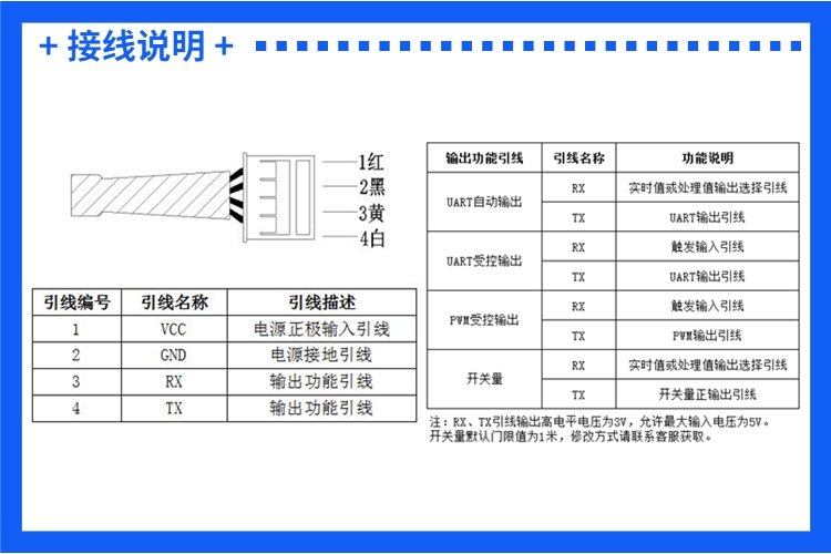 輸出方式:UART串口輸出\RS485輸出\PWM輸出\開關量