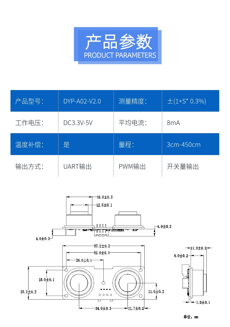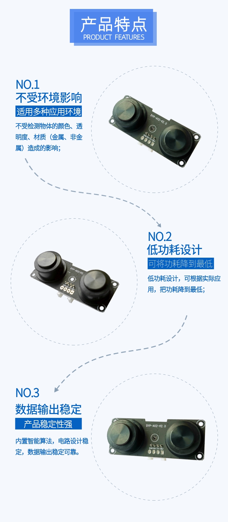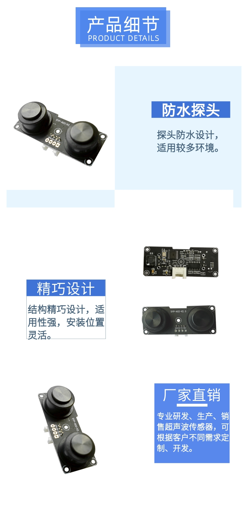 A02超聲波測距模塊,是一種應用超聲波技術對物體進行距離探測的傳感器。傳感器采用封閉式分體防水探頭結合精巧的結構設計,滿足用戶多種應用需求。多元化輸出端口設定,可支持UART輸出、PWM輸出及開關量輸出方式。低功耗設計,可根據實際應用場景,把功耗降到適用。傳感器廣泛應用各場景物體接近與存在察覺、停車管理系統、機器人避障、自動控制等。