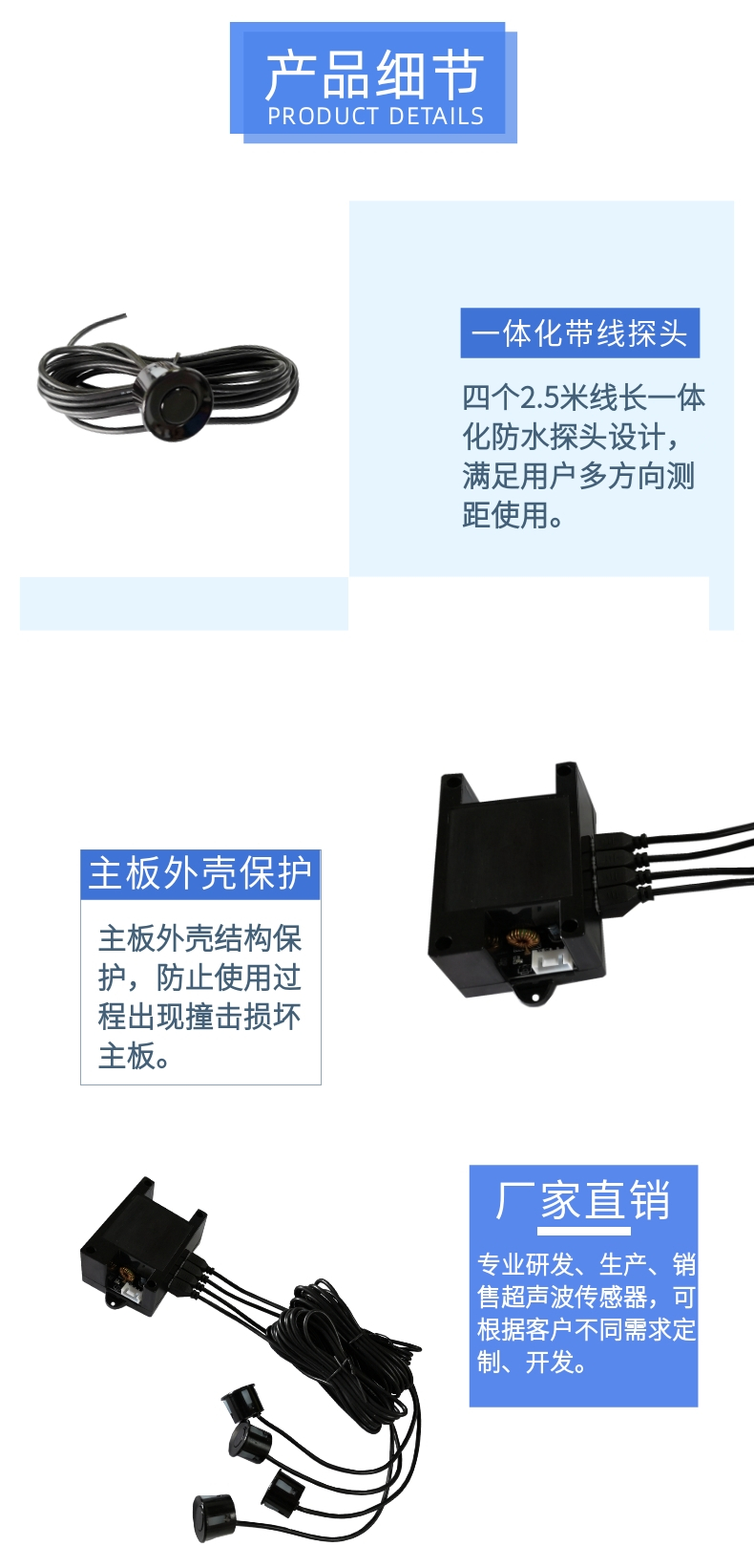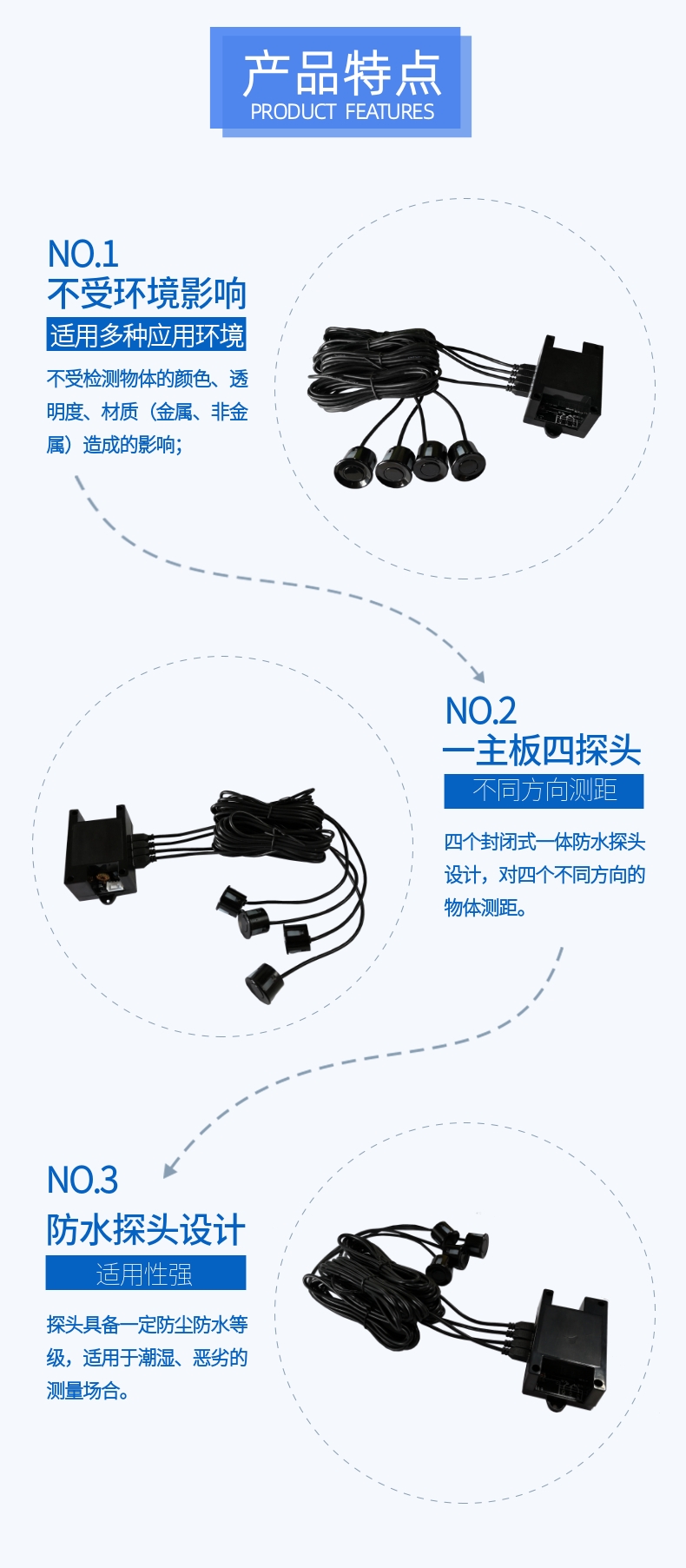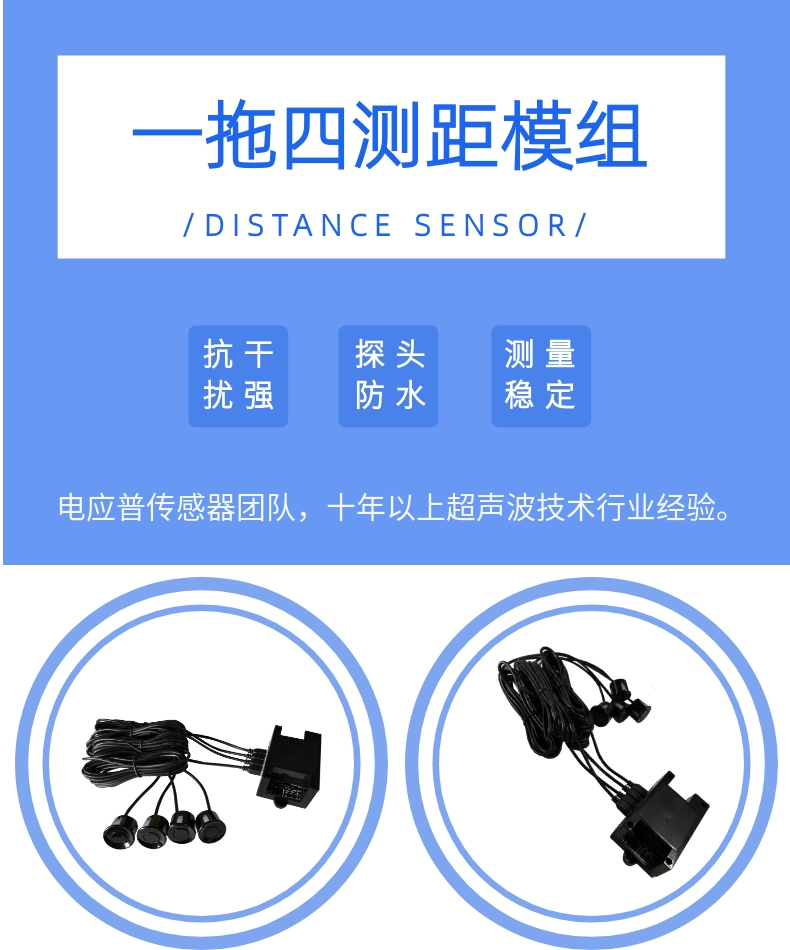 A05一拖四測(cè)距模組系列,是采用四個(gè)封閉式一體防水探頭,設(shè)計(jì)而成的一款高性能測(cè)距模組。可對(duì)四個(gè)不同方向的物體測(cè)距,具備一定防塵防水等級(jí),適用于潮濕、惡劣的測(cè)量場(chǎng)合。是一款操作簡(jiǎn)單的高性能、高可靠性商用級(jí)功能性模組。
