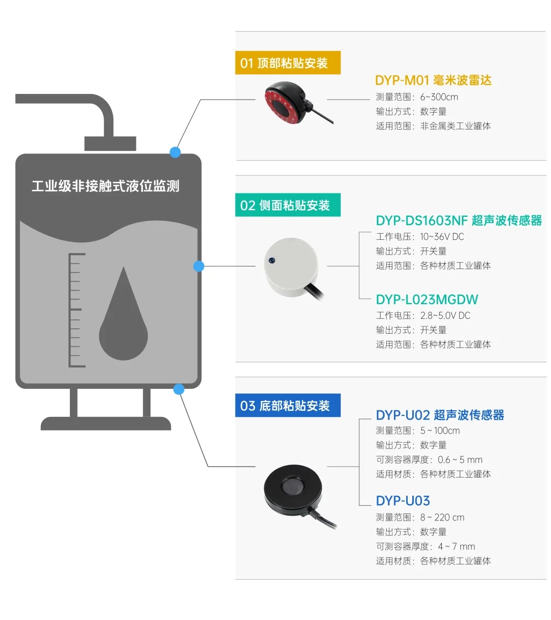 電應普針對工業非接觸式液位檢測應用開發了一系列產品,適用于不同的非接觸式液位監測應用場景需求。