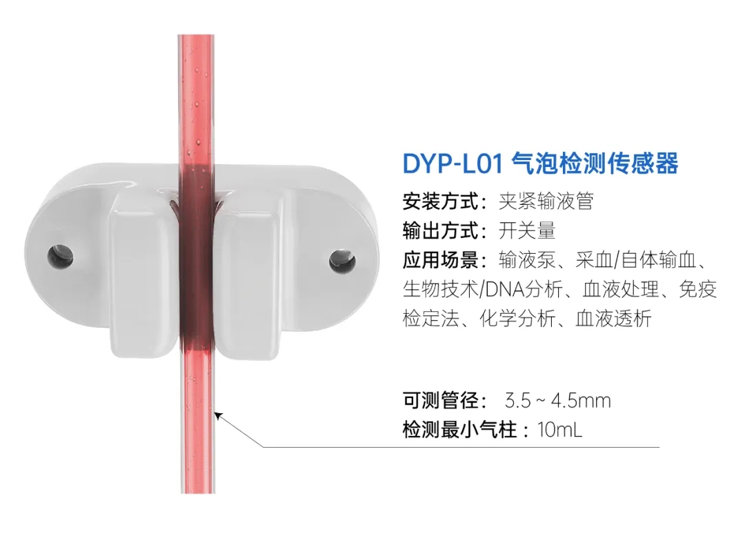 L01 模組采用超聲波技術,用于非侵入性連續監測輸液管道中的氣泡,能夠識別管道中流動的液體是否中斷或存在氣泡,適用于 3.5~4.5mm 外徑輸液管,其它規格管徑可根據用戶要求定制。