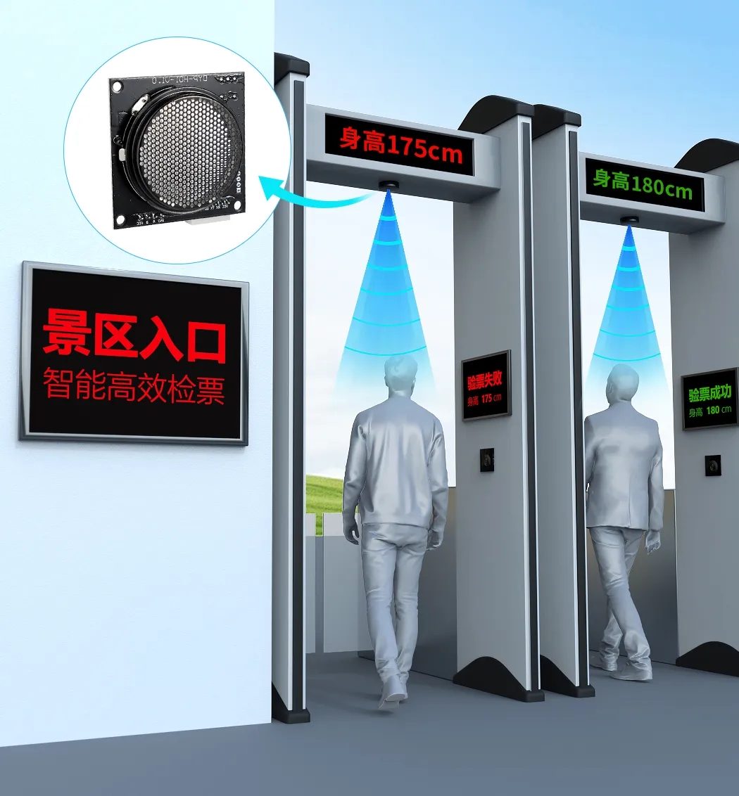 因此對于市面的驗票入口閘機測身高場景應用,我司專門配套研發了DYP-H01超聲波測身高傳感器,DYP-H01以其精準的測量能力去輔助驗票入口閘機進行工作(如圖一所示),提升了驗票體驗,且誤差極小,能夠準確區分不同身高的旅客,為后續的票務驗證、優惠政策執行等提供重要依據。